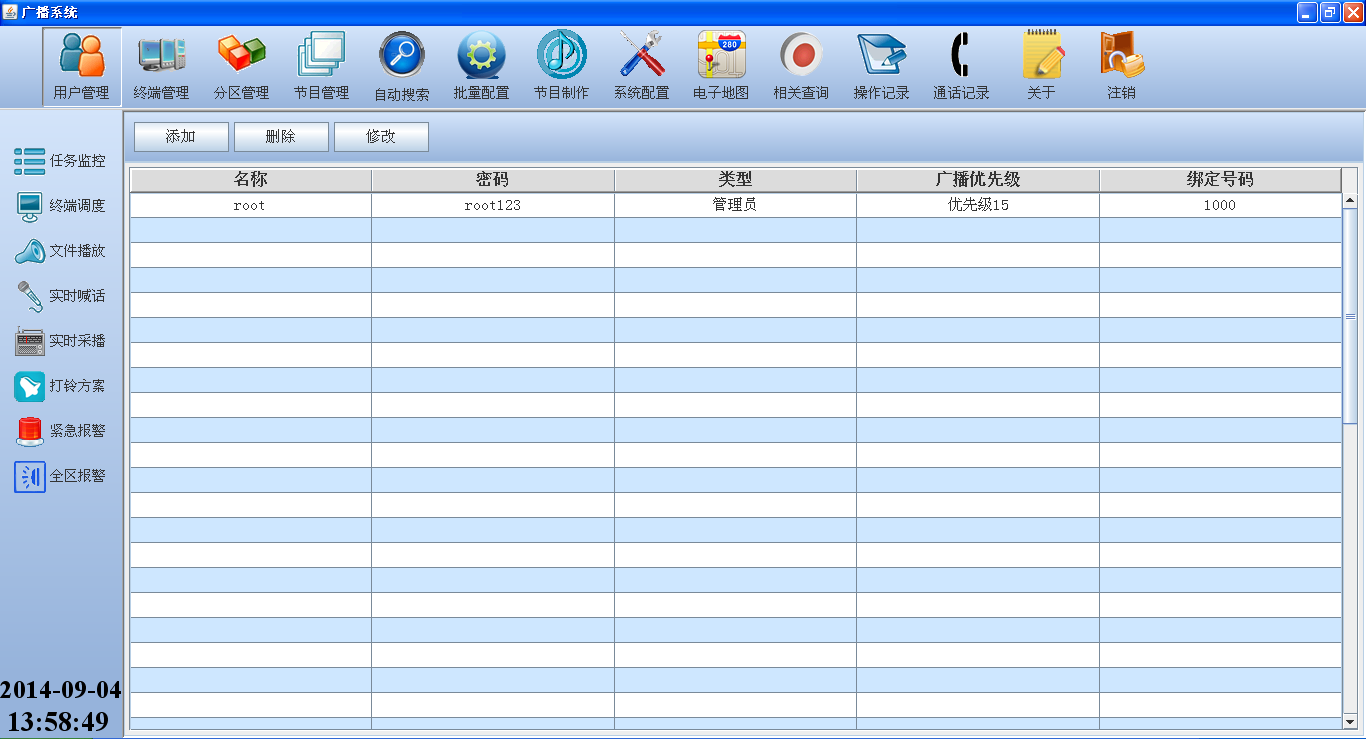 广播系统主机、广播寻呼台、广播客户端均开机在线,在同一网段,所有操作在客户端程序上进行,操作、配置会保存到服务器,服务器基本不用操作,保持开机在线就可以。