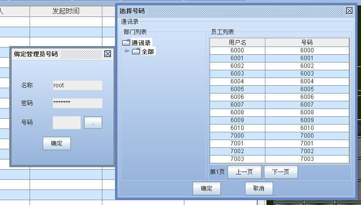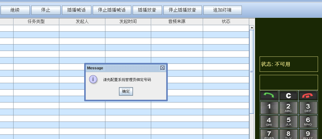 是初次安装后root用户第一登录,登录后软电话状态是“不可用”,此时系统会弹出提示对话框,要求root用户绑定系统内一个号码,该号码与上图中的软电话绑定,广播业务实现也是通过该绑定号码来实现。